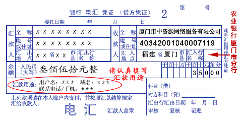 提示:請(qǐng)?jiān)谵D(zhuǎn)賬時(shí)備注欄里注明您在中資源的用戶名,并在匯款后及時(shí)聯(lián)系我們查對(duì)。